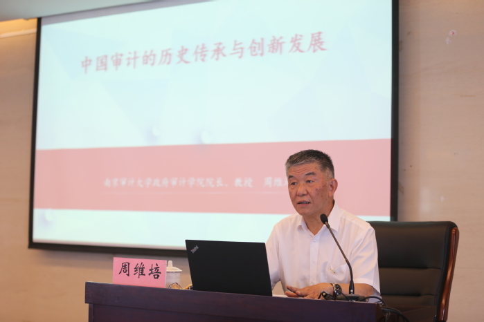 6月29日下午,我校审计处应邀参加南京审计大学举办的“中国审计的历史传承和创新发展”党史学习教育专题讲座。讲座由南京审计大学政府审计学院院长周维培教授主讲,南京审计大学审计处处长周方舒主持,南京审计大学校长刘旺洪致辞,江苏省教育厅监督与审计处处长吴仁林发表讲话。江苏省教育厅监察与审计处、浦口区审计局及浦口区部分单位审计人员及部分在宁高校审计人员聆听了讲座。
